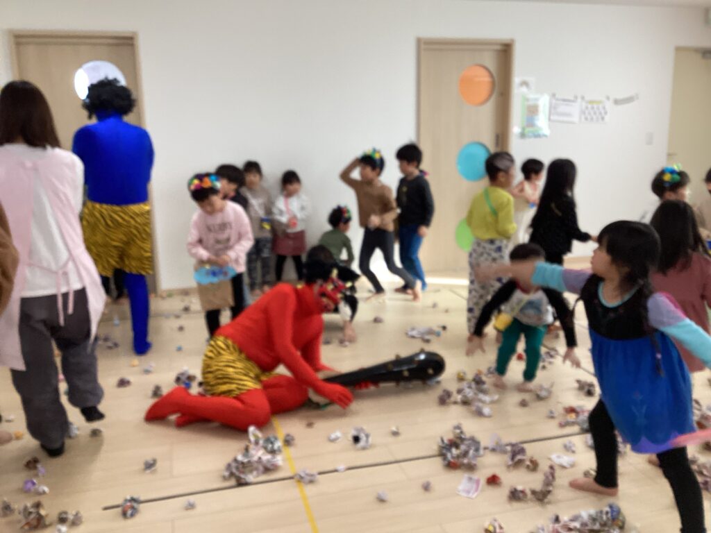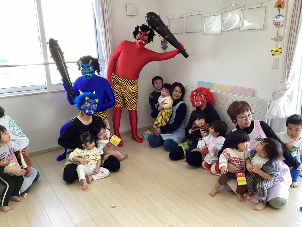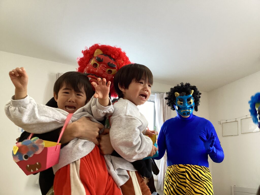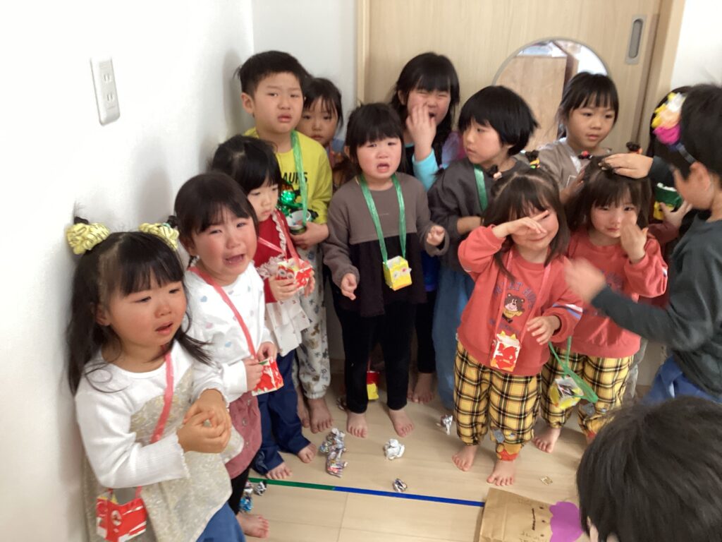 幼児組さんは、豆を鬼に向かって「鬼は外~」と頑張って投げています。