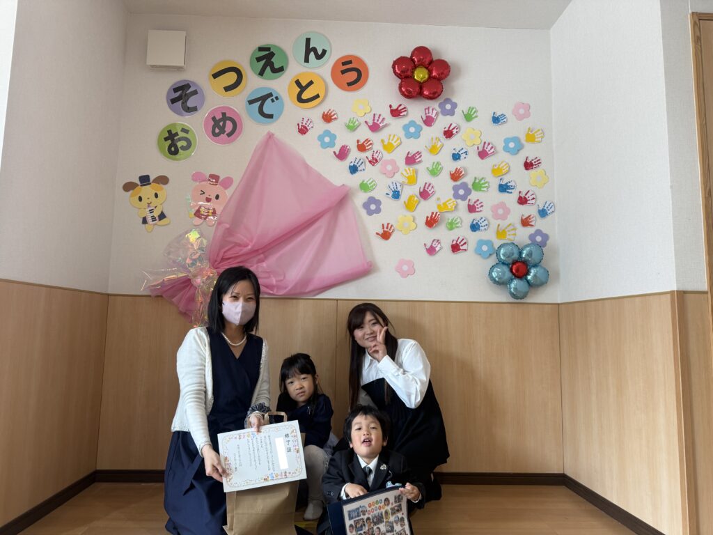 ラブクローバー神沢の保育に日々温かいご理解とご協力をありがとうございました。これから新しい環境へと進まれるお子様たちがさらに心も体も大きく成長されていくことを、職員一同心より願っております。お子様たちの笑顔と共に過ごした日々は、わたしたちにとってかけがえのない宝物です。これまでお子様の成長を見守らせていただけたこと、心より感謝申し上げます。