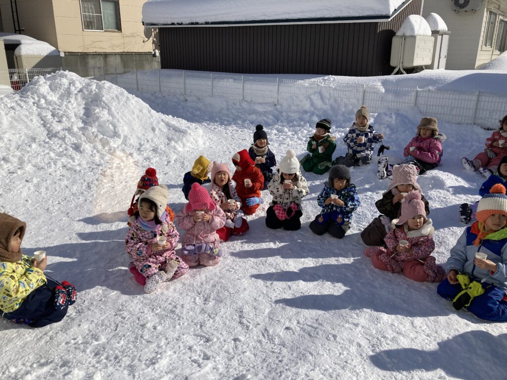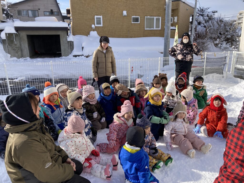 次は、うさぎ・そら組さんの雪中かけっこ会の様子です!園庭に集まって「はやく遊びたーい!」と楽しみな様子の子どもたちでした♪