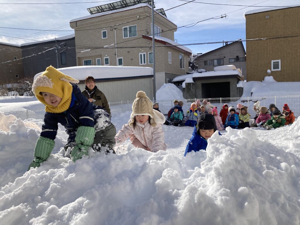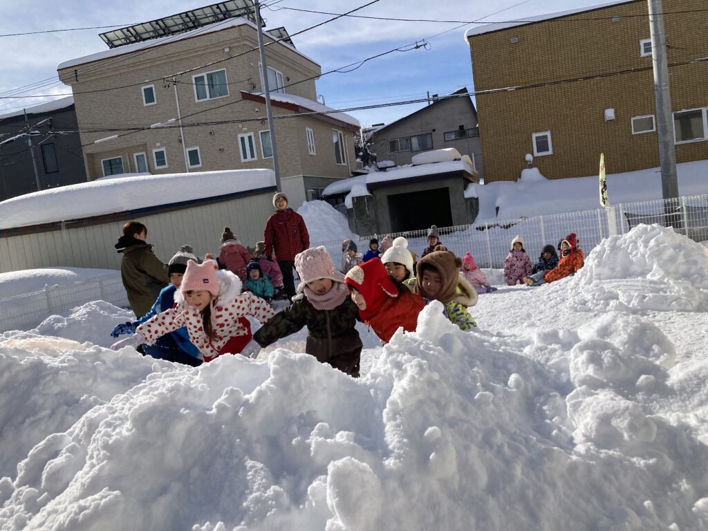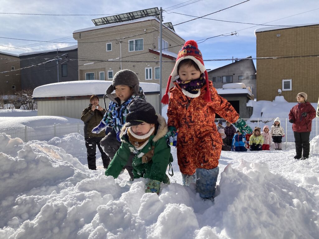 最初の種目は”雪山かけっこ競争”!!園庭の真ん中にある、大きな雪山を登り往復するコースで、かけっこをしました。たくさん積もった雪に大喜びでしたが…