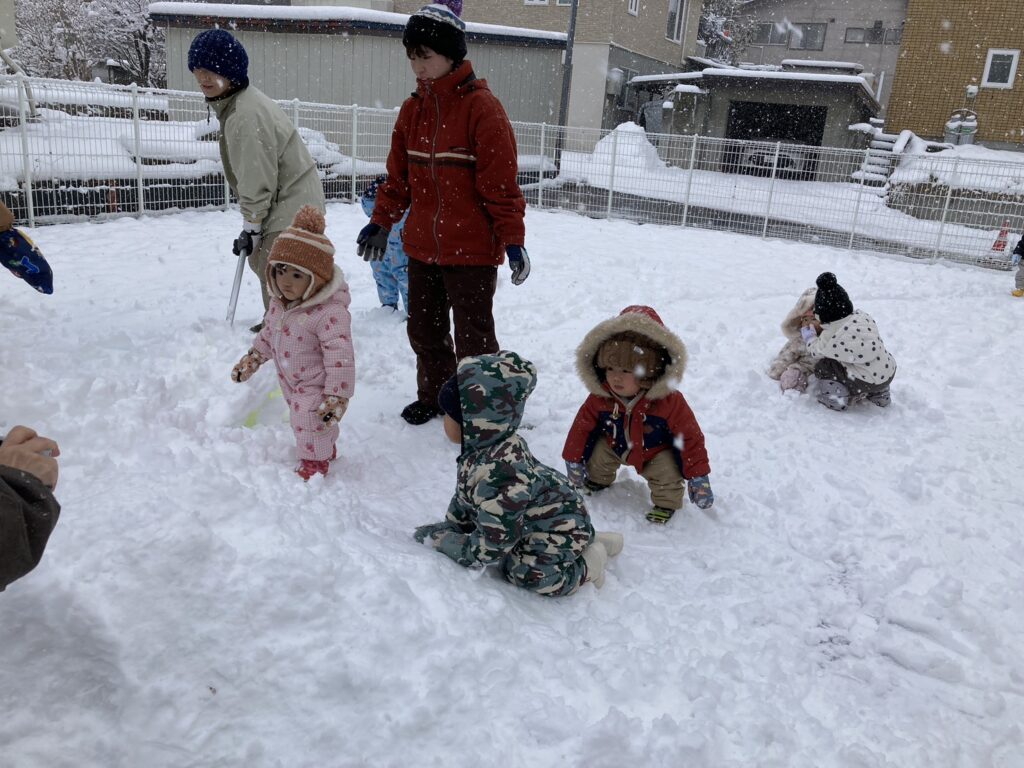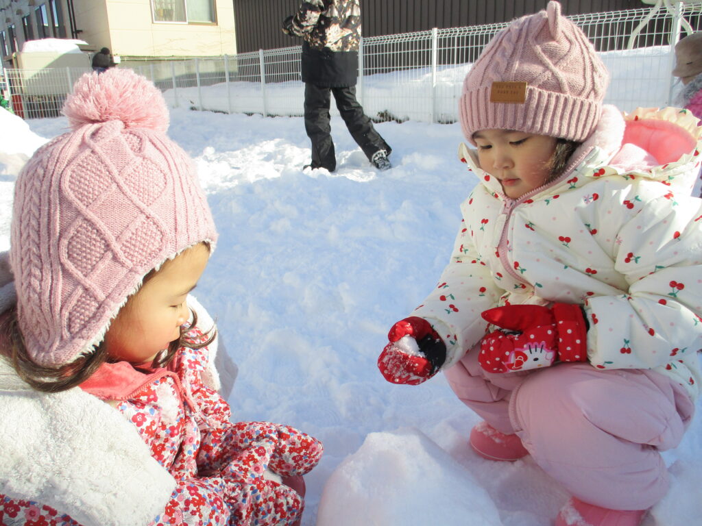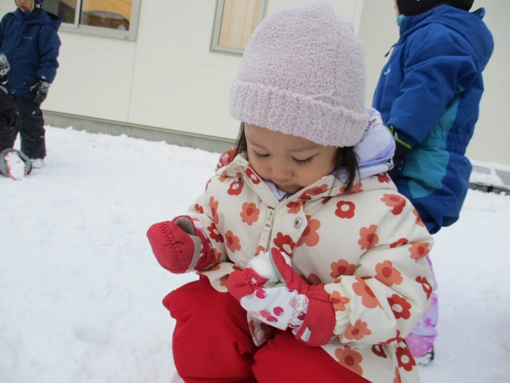 小さいひよこ組は、保育士と一緒に雪を触ったり雪玉を作ったり楽しんでいます。