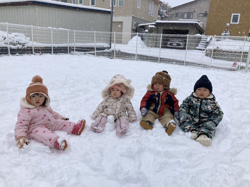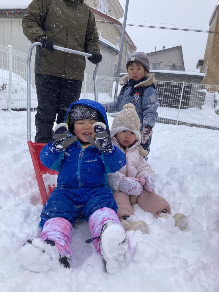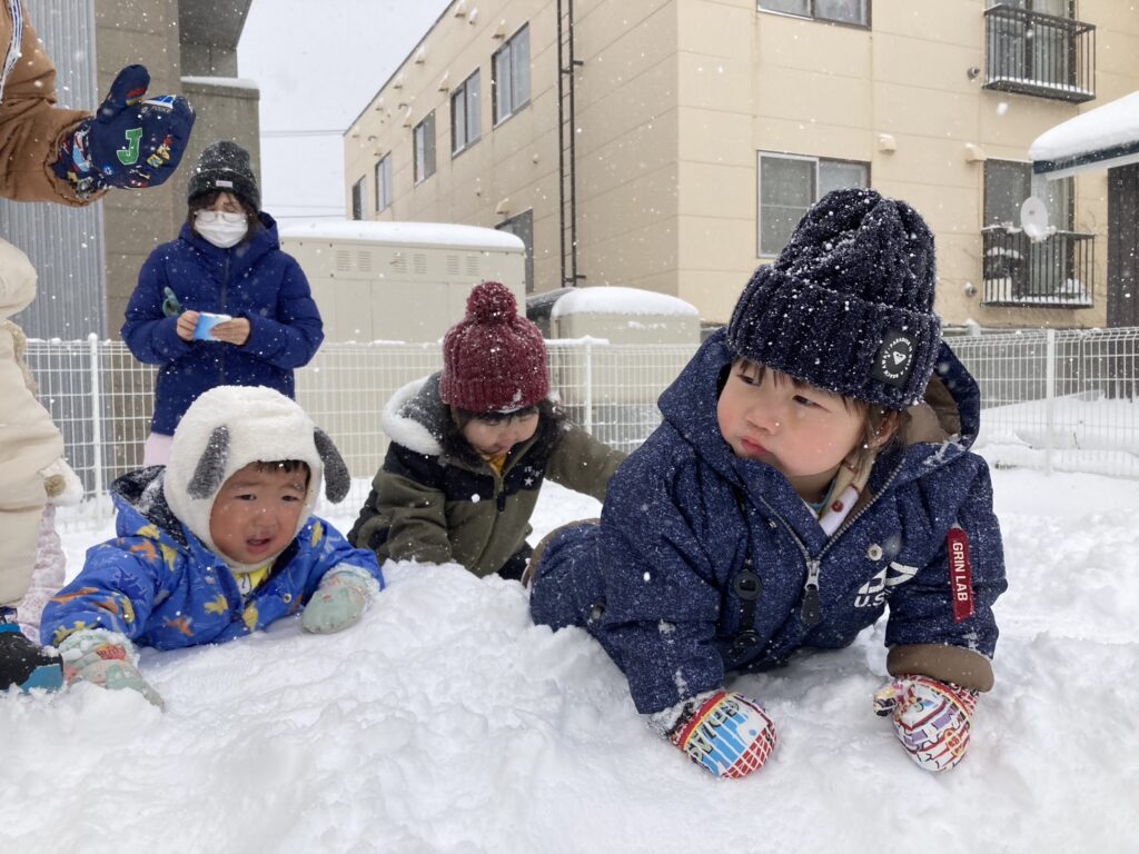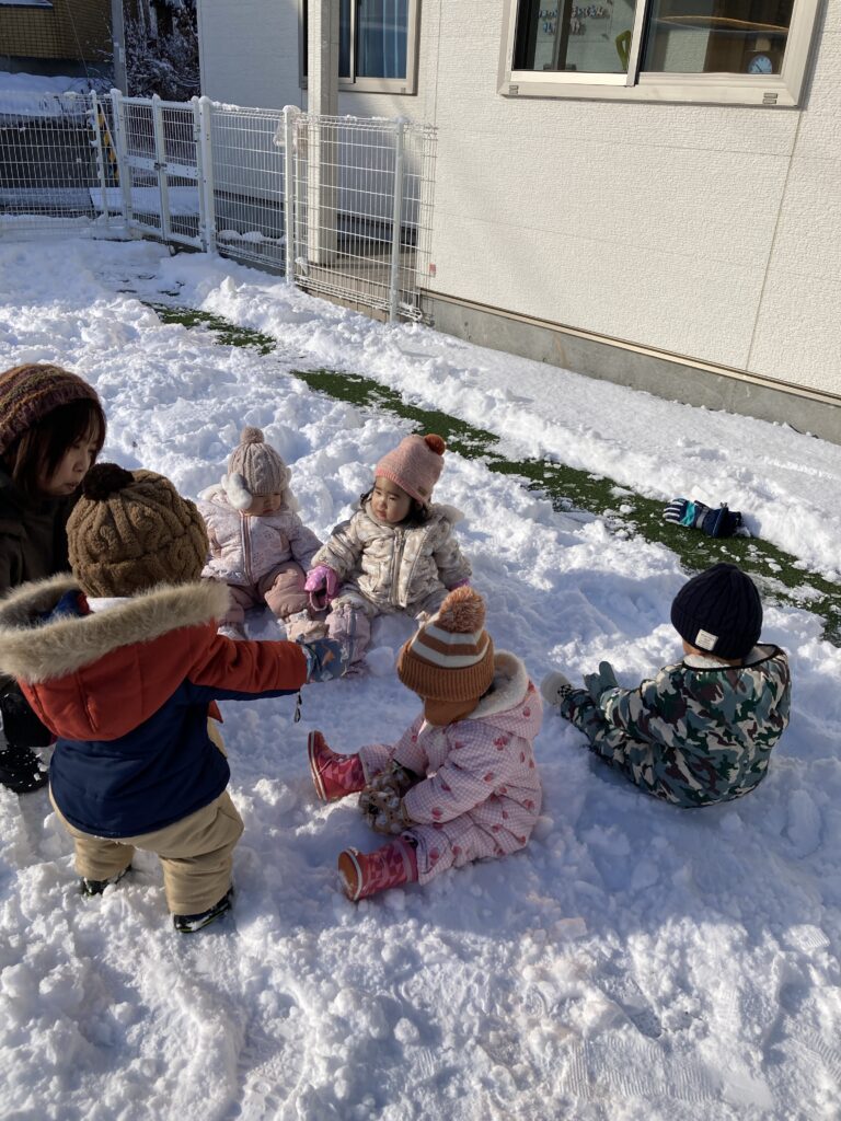 今シーズンが初めての本格的な雪遊びを経験する子ども達ですが、泣くこともなく、楽しんでいる様子です( ´艸`)