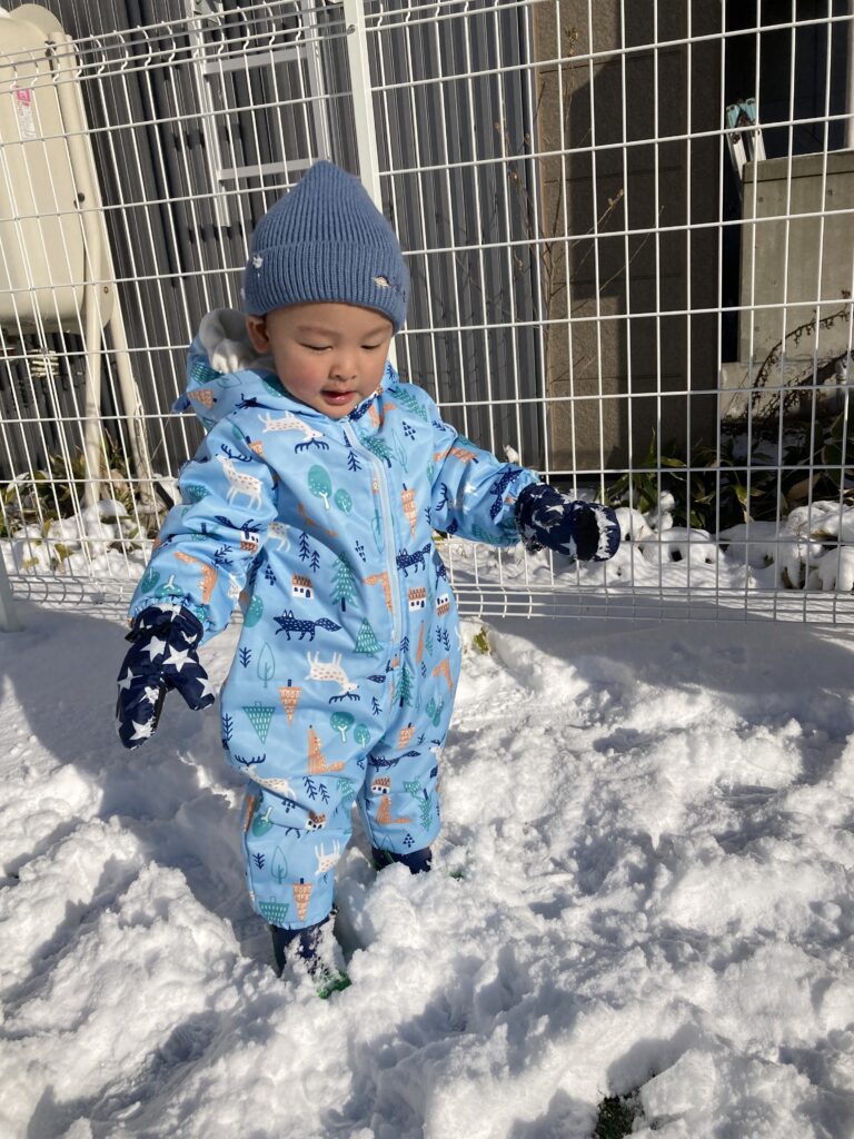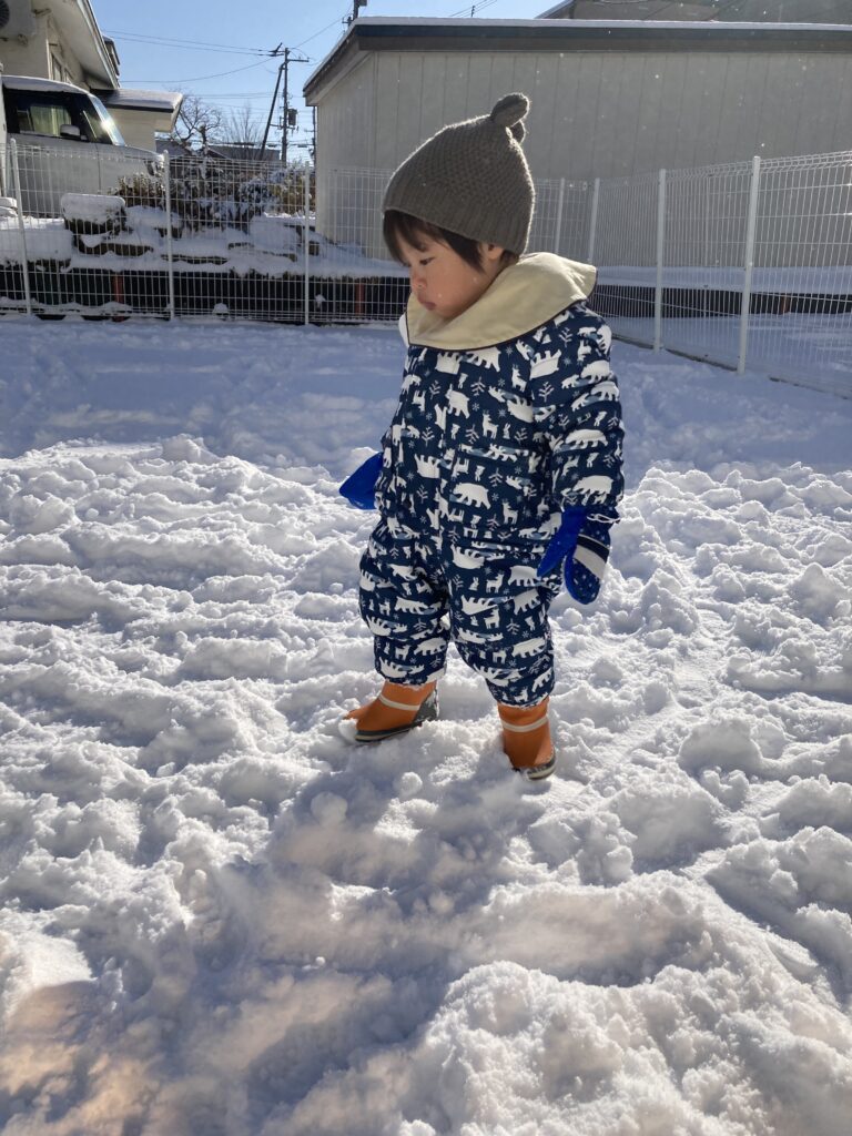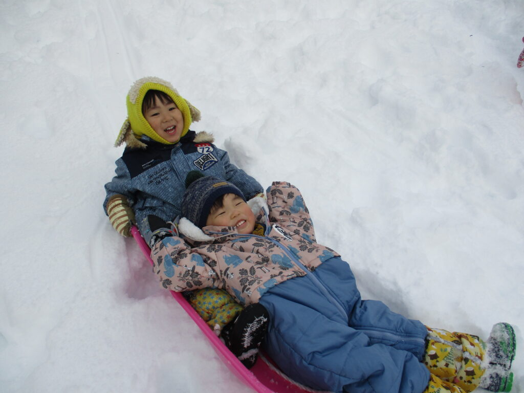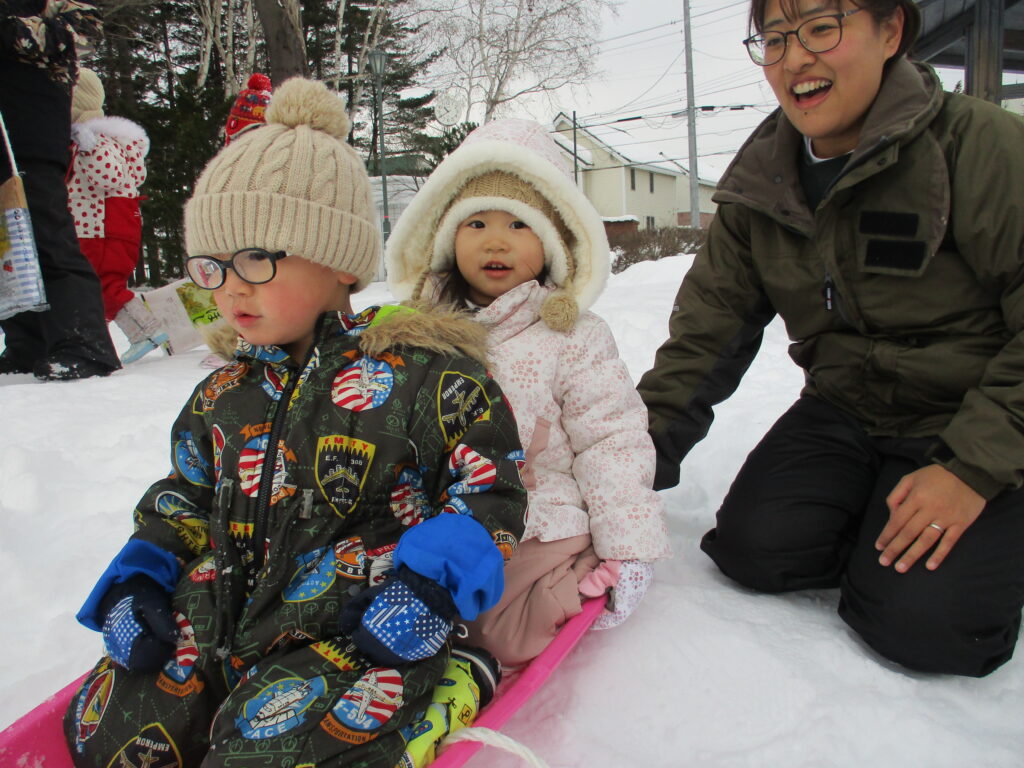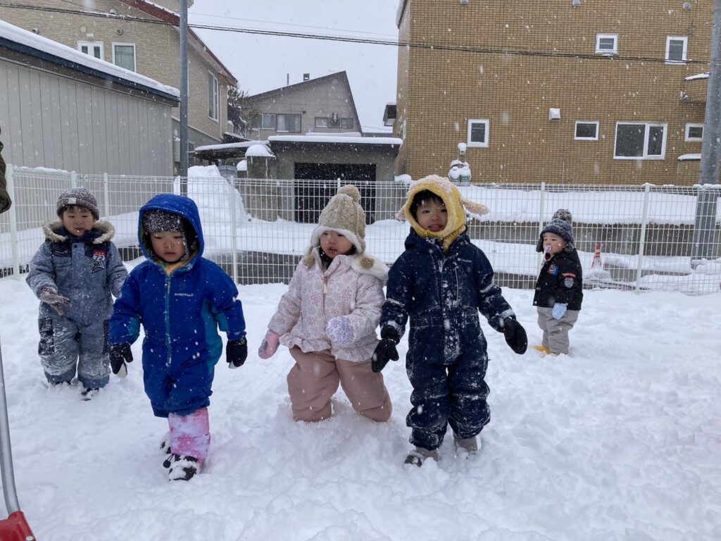 今シーズンが初めての本格的な雪遊びを経験する子ども達ですが、泣くこともなく、楽しんでいる様子です( ´艸`)