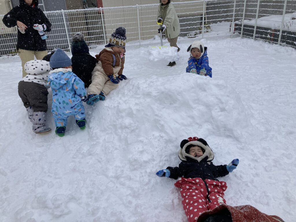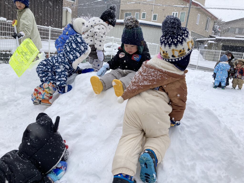 保育園の園庭の雪山はまだまだ小さいですが、それでも乳児の子ども達にとってはスリル満点です!