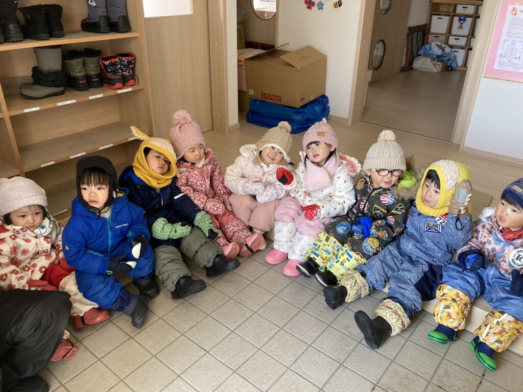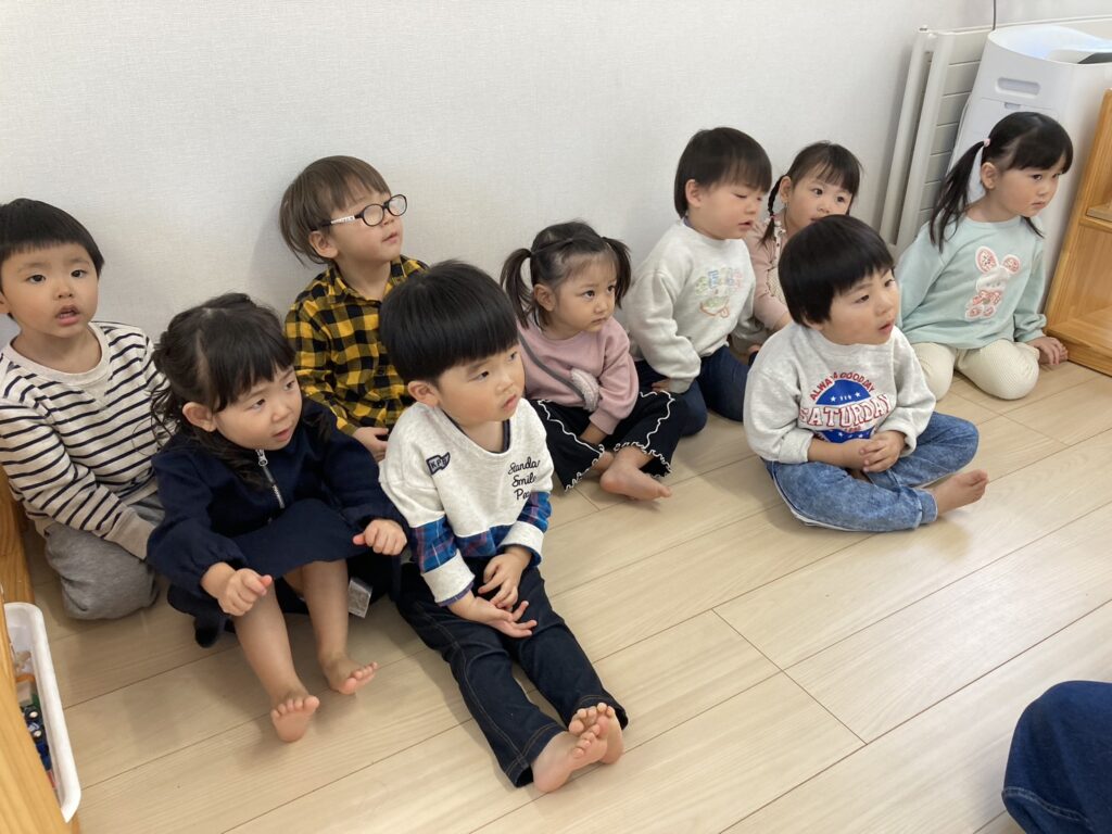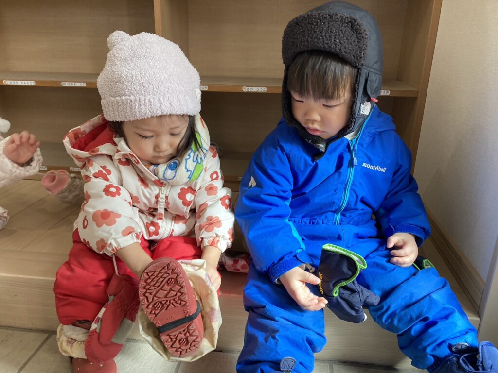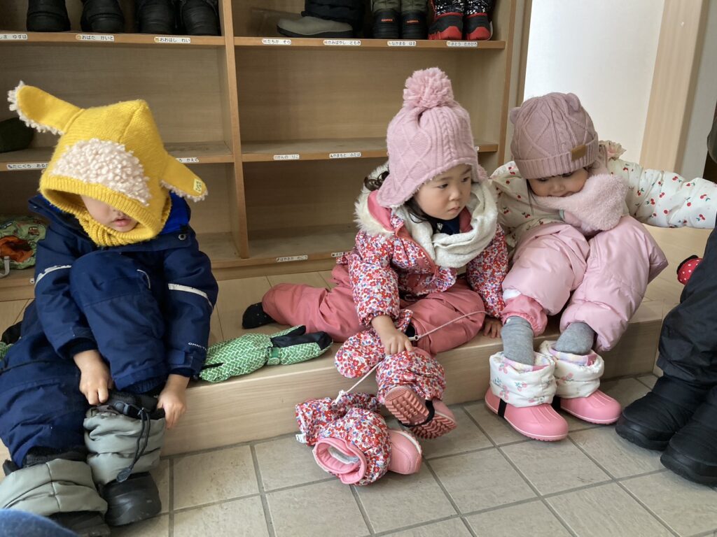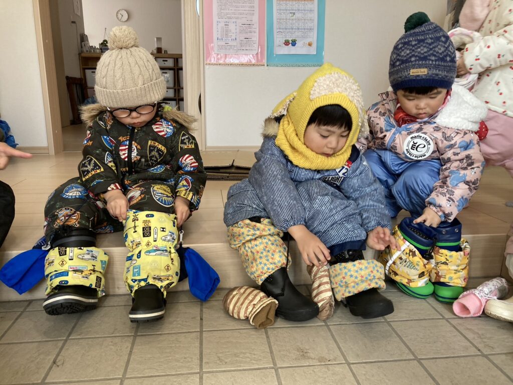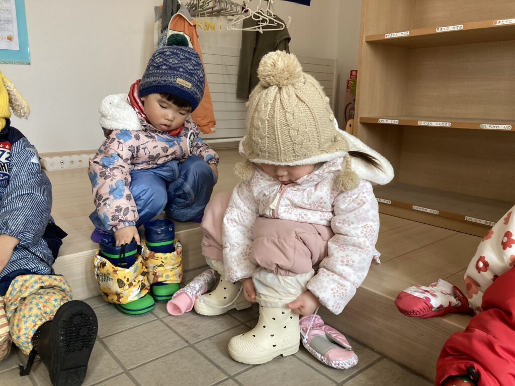 難しい靴カバーも出来ないところは手伝ってもらいながらも、『自分でやってみよう!』と、意欲的なうさぎ組さんです🐇