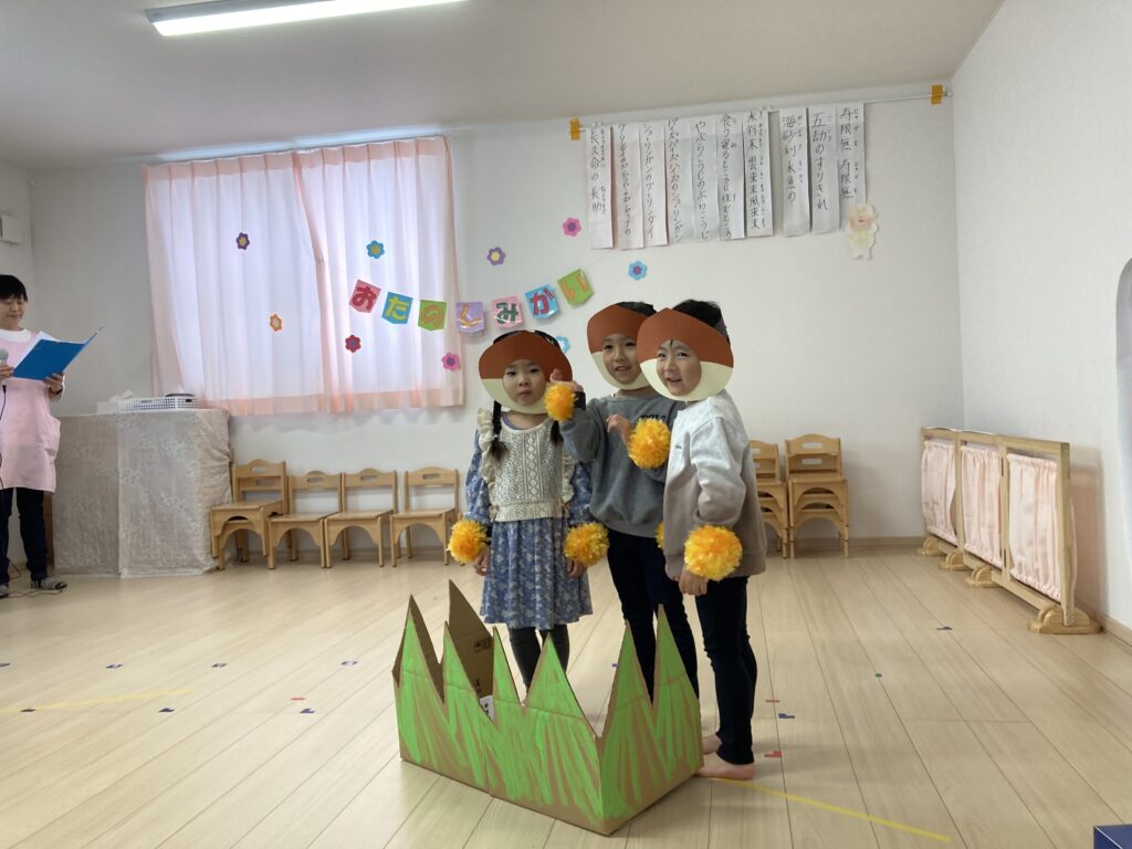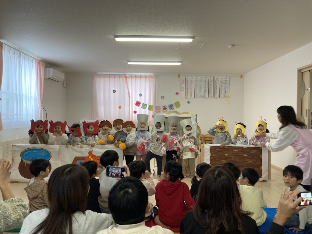 そら組全員で元気に歌ったあとは、ほし☆グループ(3歳児)・つき☽グループ(4歳児)による劇、『さるかにがっせん』です。