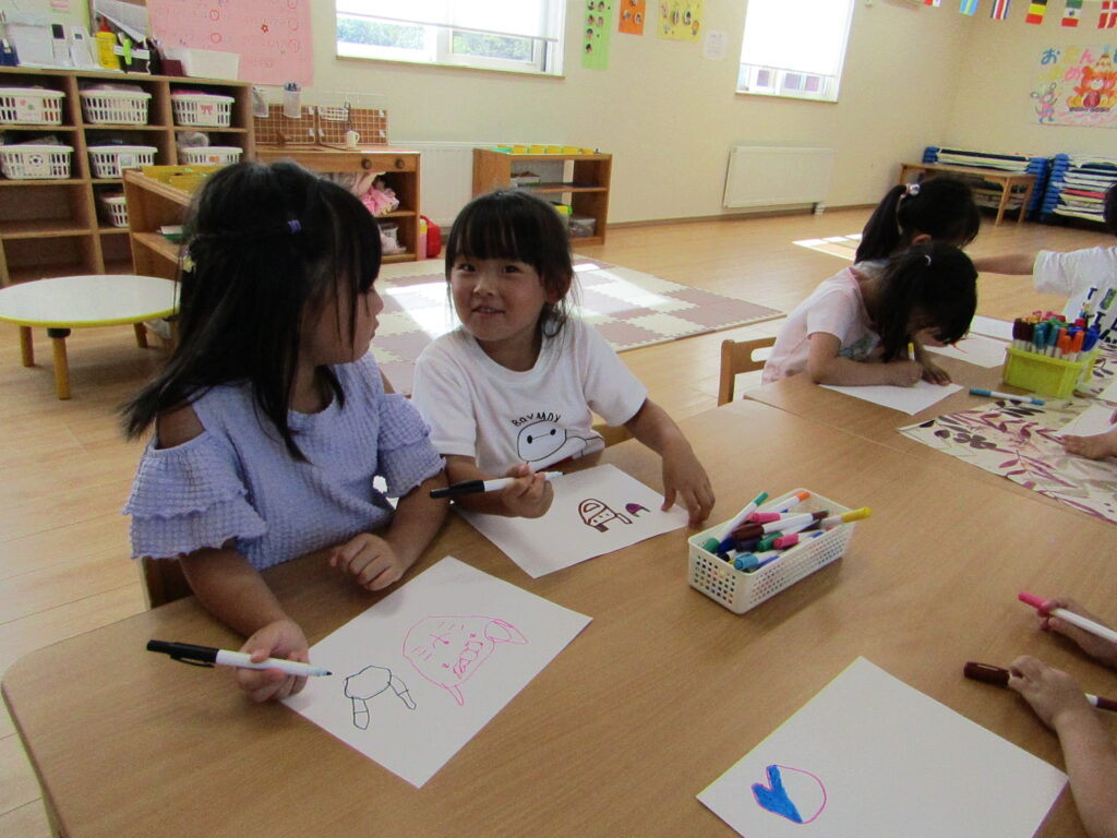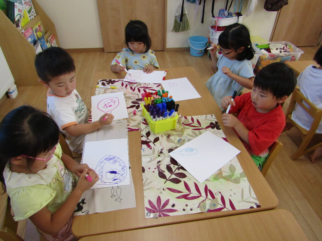 お部屋の天井に飾ってある旗を見ながら書いたり、好きな絵を描いたりしていましたよ~