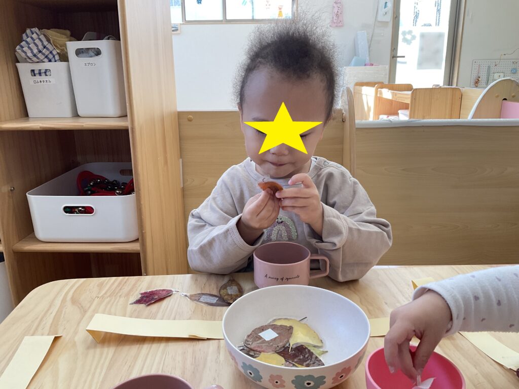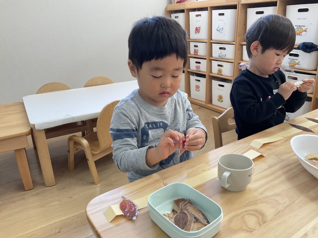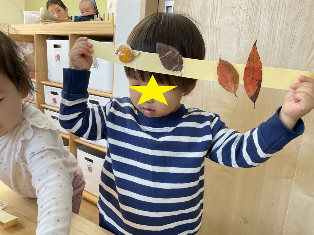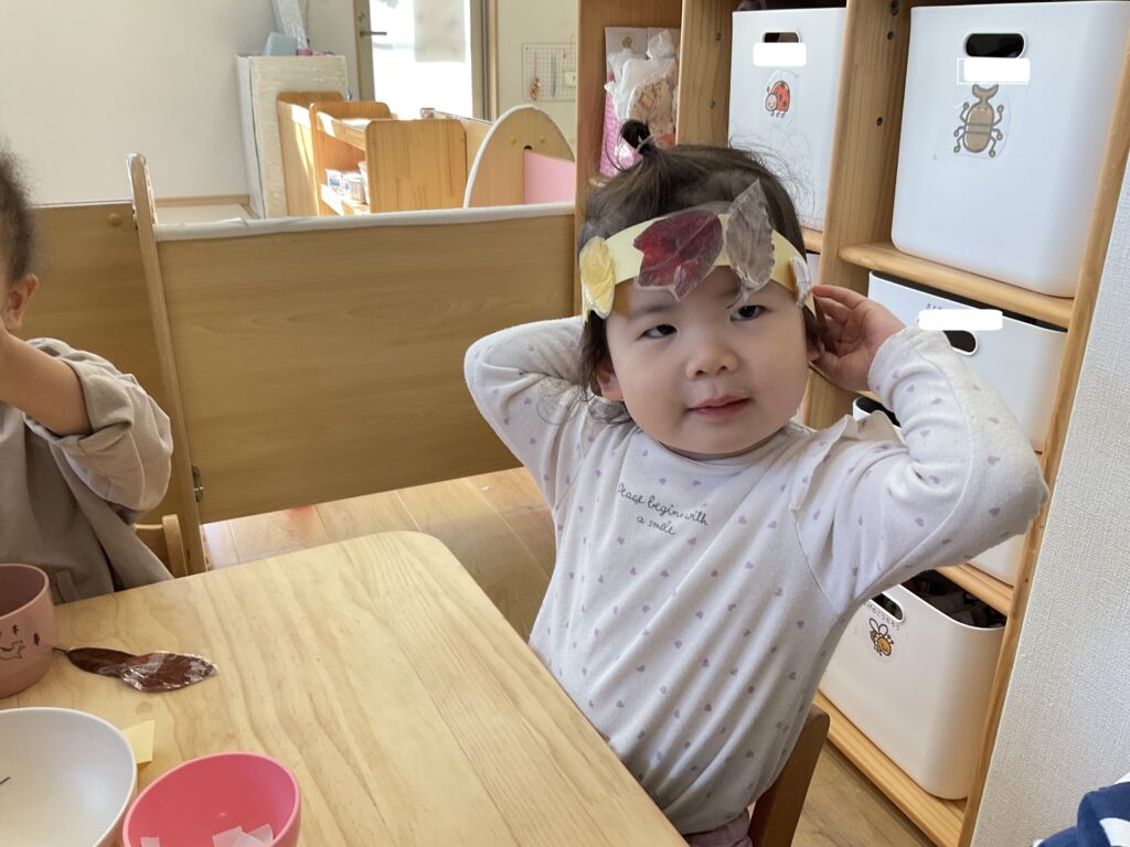 うさぎ組さんがお散歩で集めた落ち葉で冠を製作中です🍂