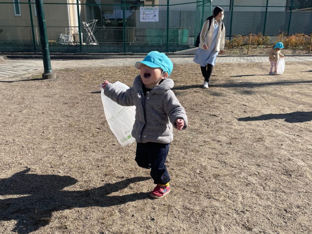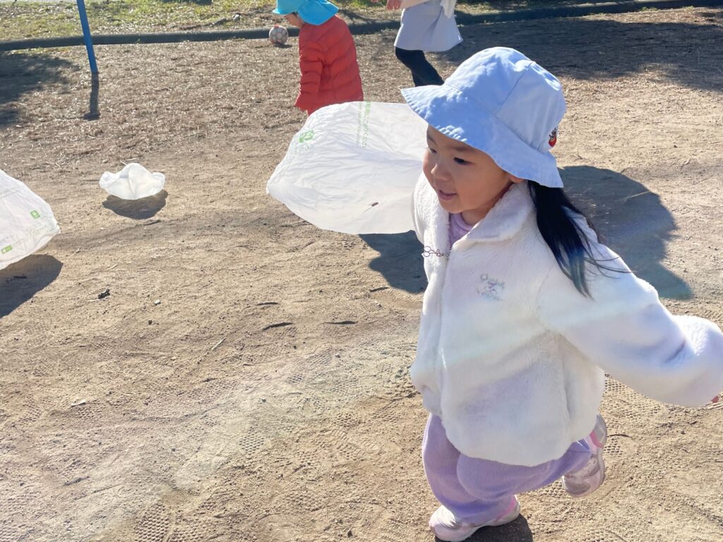 完成した凧を持って戸外に出ると、風にのってふわっと揚がり、凧を見上げながら一生懸命走っていました🪁