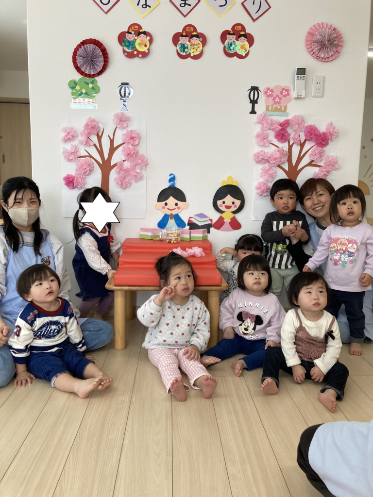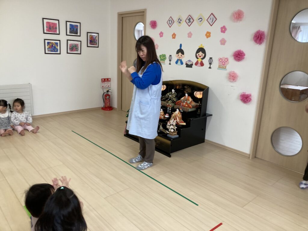 今日はひなまつりです。みんなでひなまつりの歌を歌って、由来を聞きました。