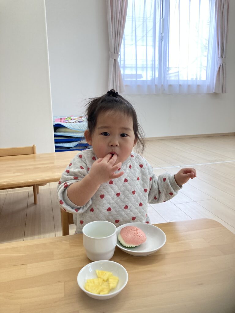 ひよこ組さん、りす組さんは、お盆にひし餅をのせて、ひな壇に飾りました。