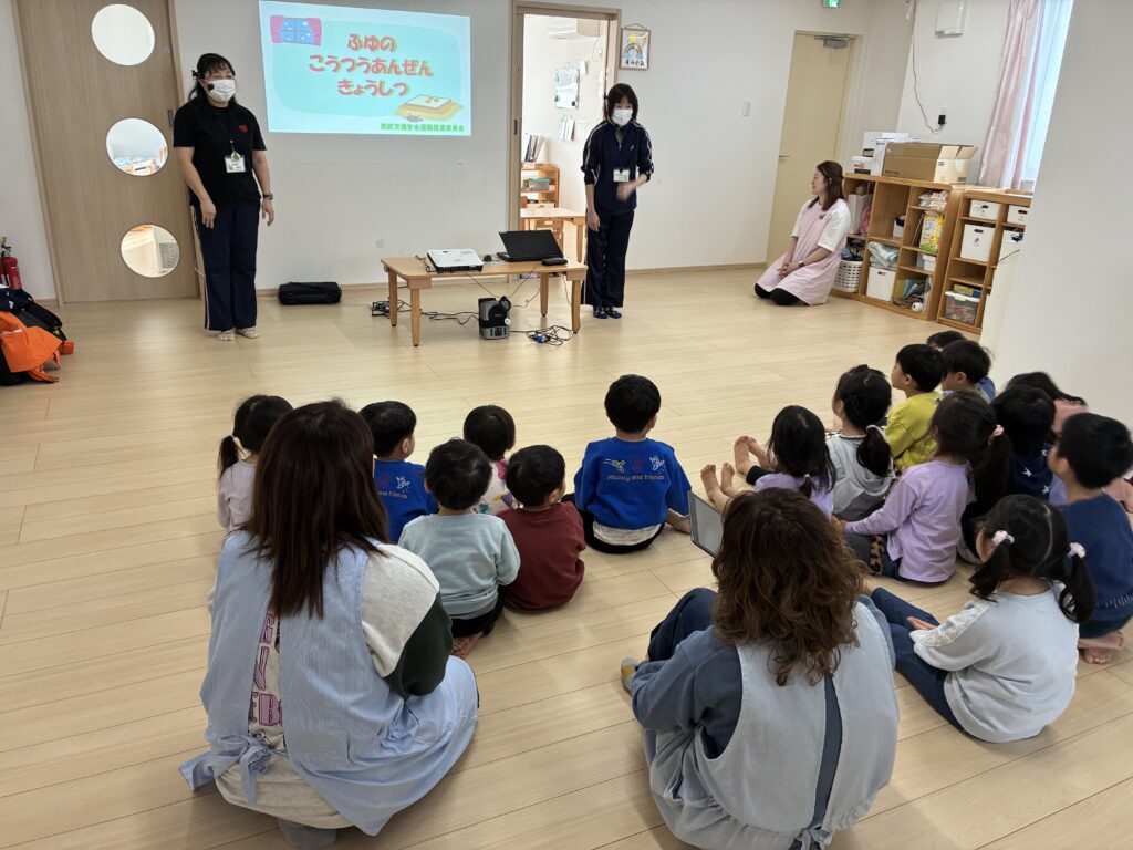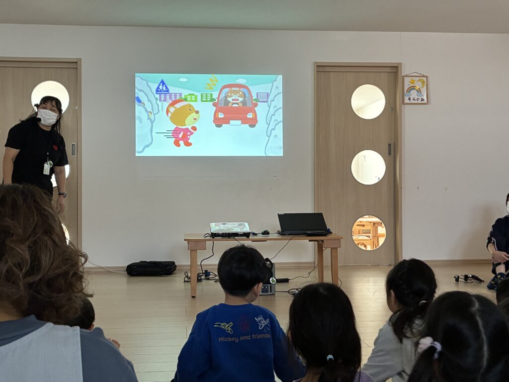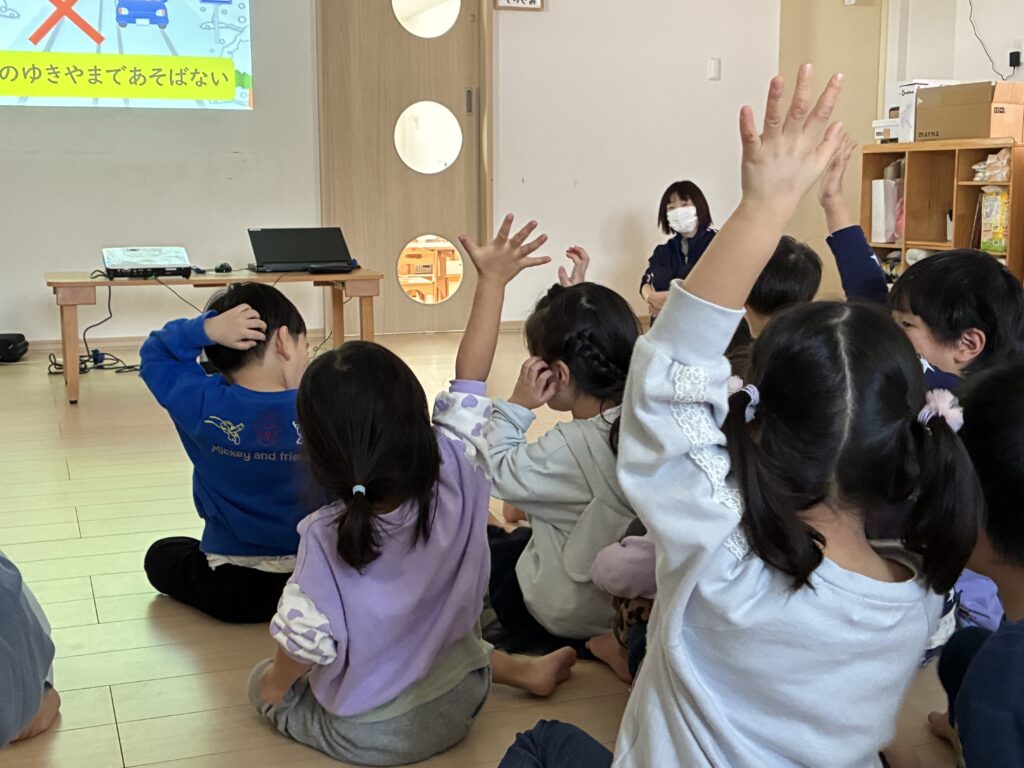 「どうろのゆきやまであそばない!!」守れる人?「はーい」と途中クイズも交えながら、楽しんで交通ルールを学ぶことができました。