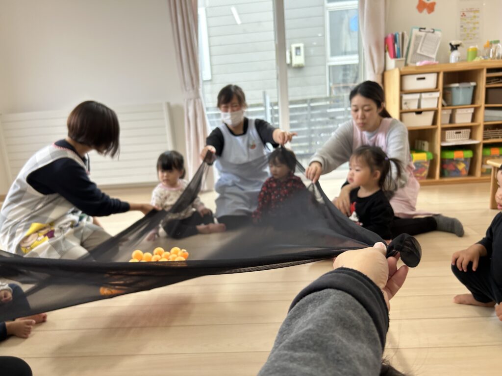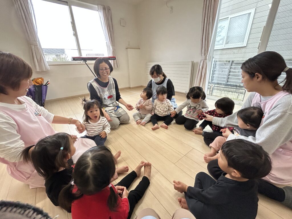いつも少し緊張している乳児クラスさんですが、今日は思いっきり楽しんでいます♪