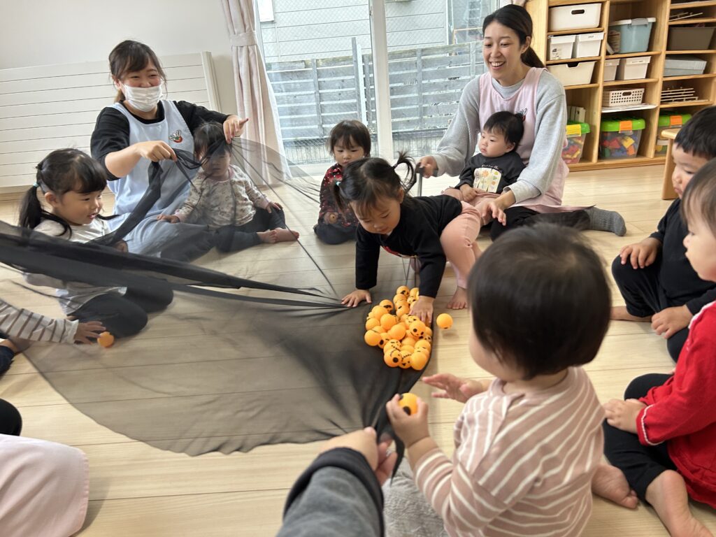 大きな布にたくさんのピンポン玉のお化けを乗せて、歌に合わせて飛ばします。