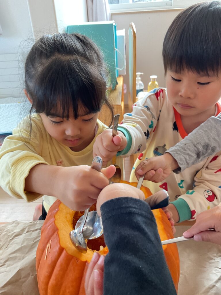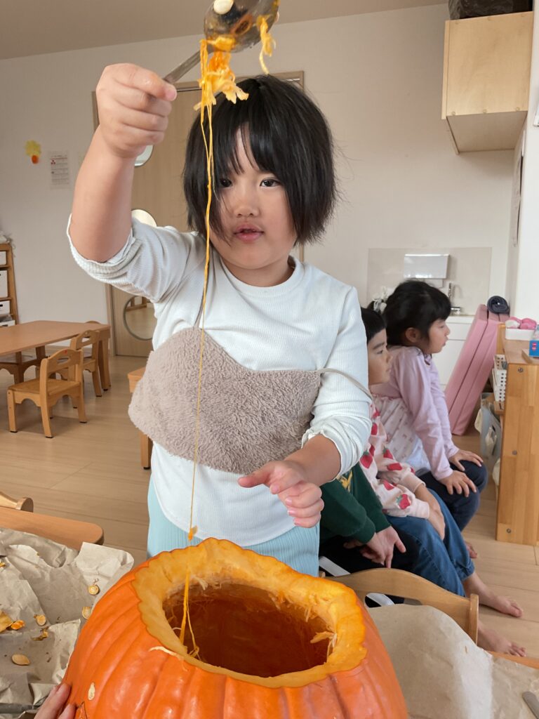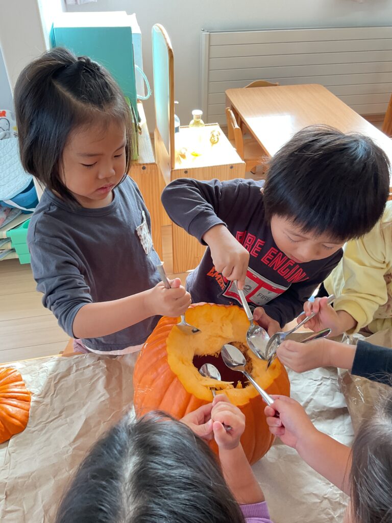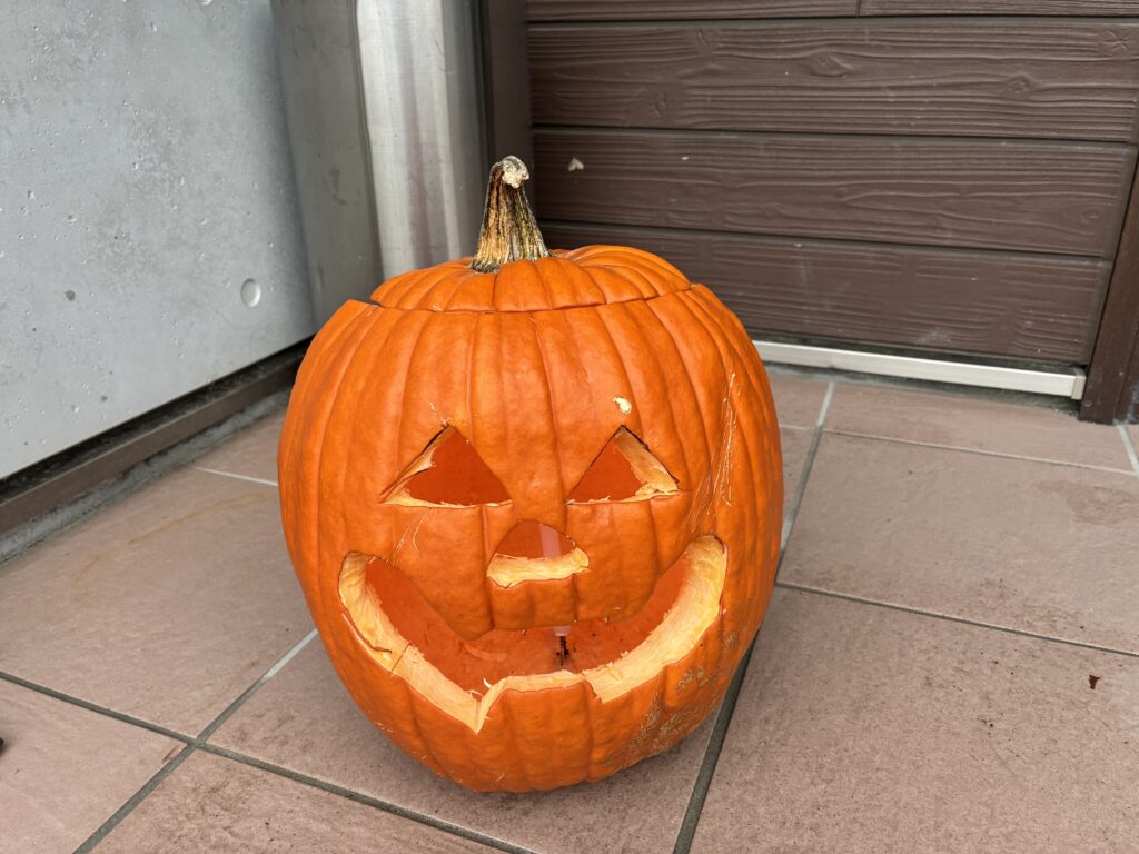 今年は、おばけカボチャが手に入ったので、みんなで実を削って、ランタンを作りました。