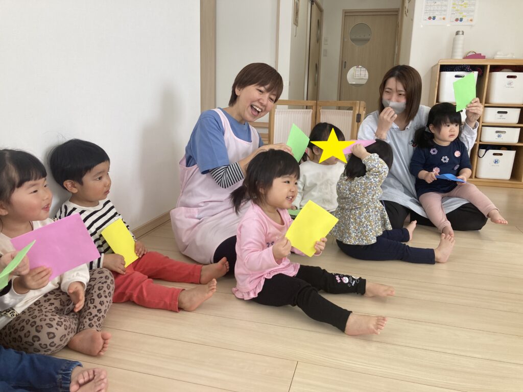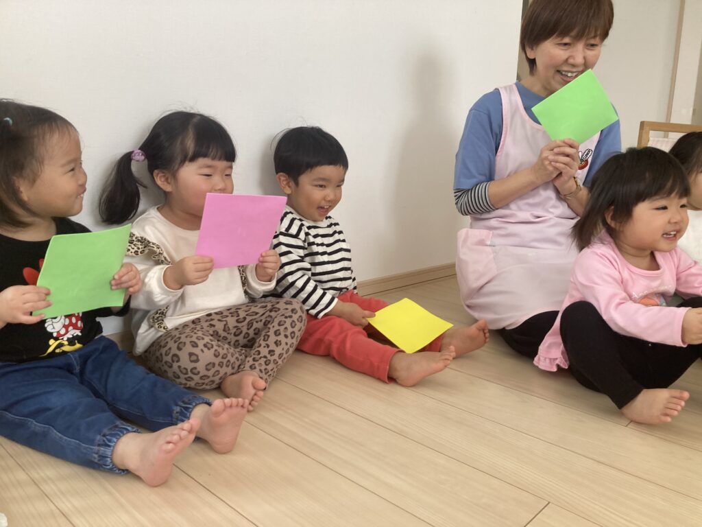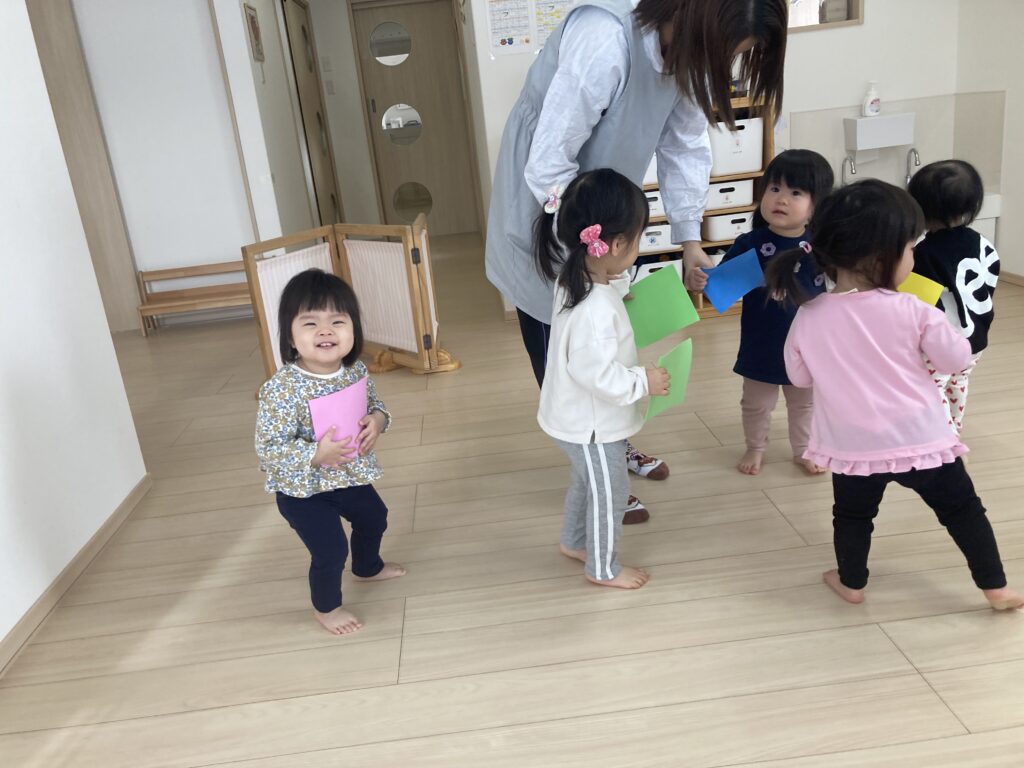 3月になるとひなまつりがあるので、“うれしいひなまつり”を歌いながら、きれいな紙を持って、顔を隠しながら歩いて、止まったら「ちらっ!!」・・・と顔を見せてくれました。