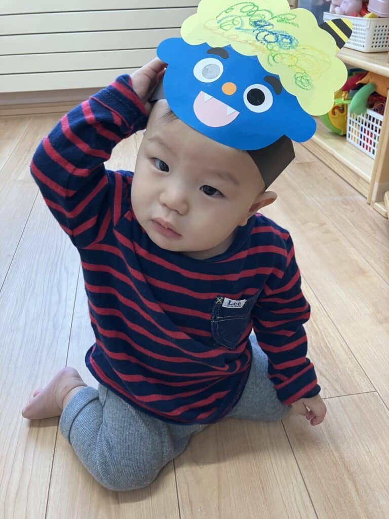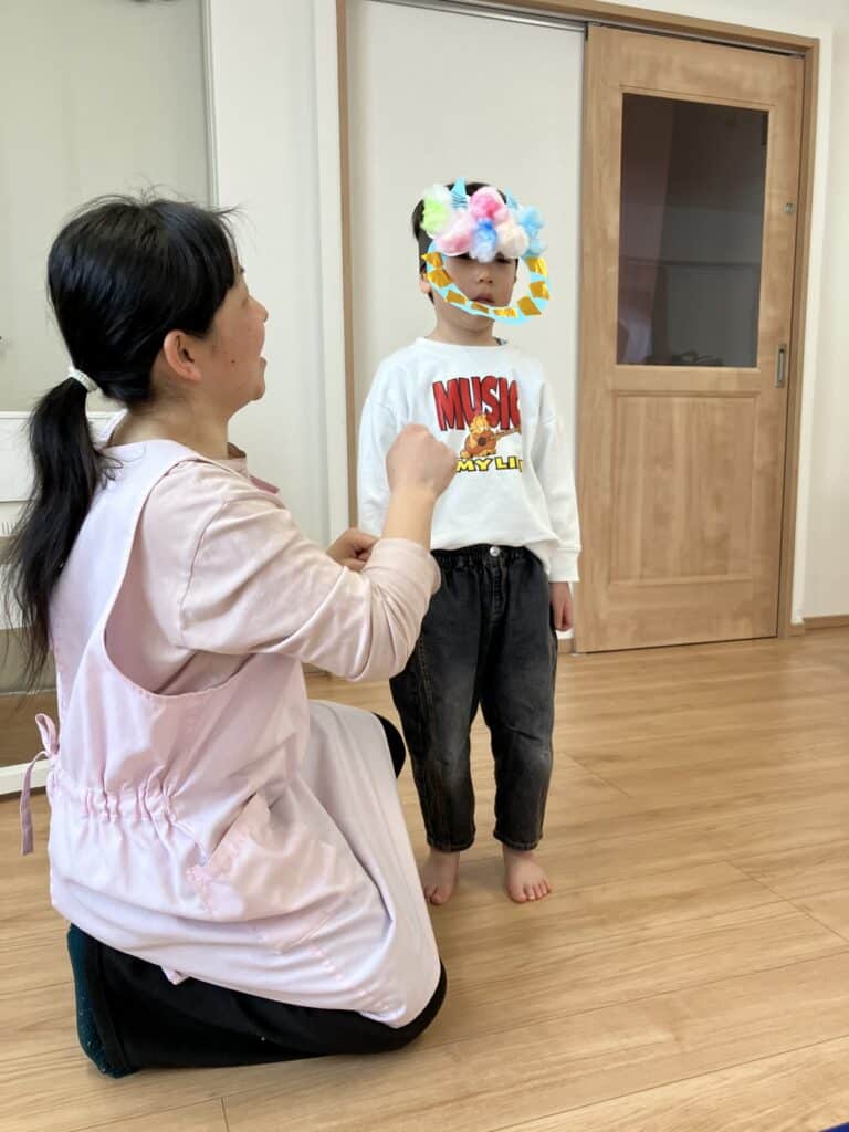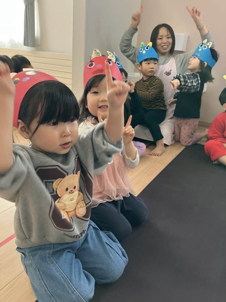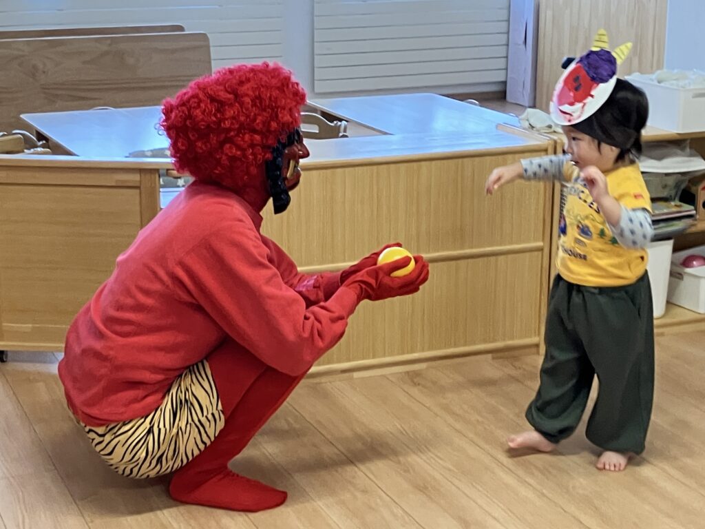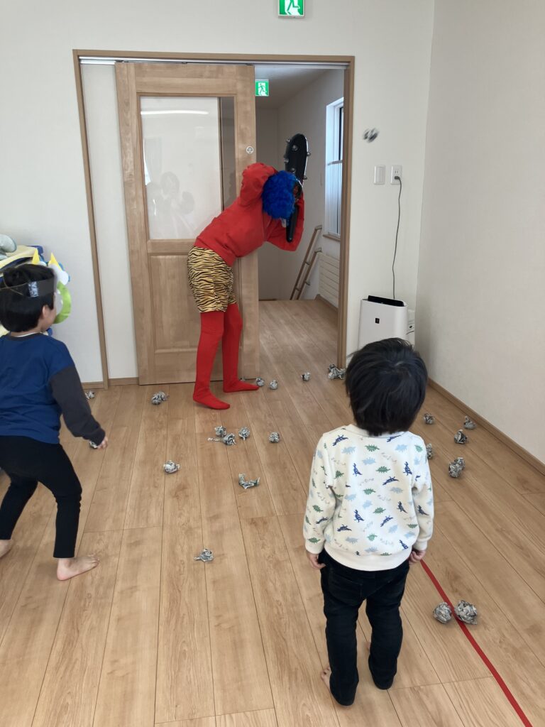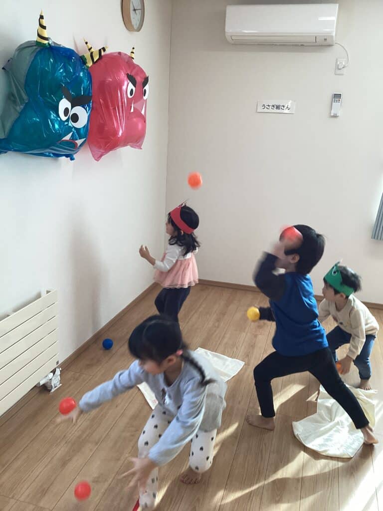 保育士が用意した鬼に、豆代わりのカラーボールでを使って